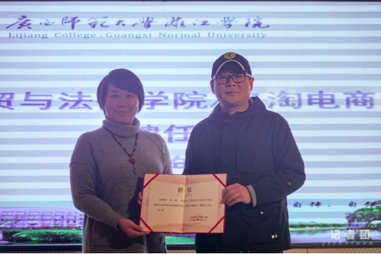 副校长杨庆庆为江战副总裁颁发聘书,我院正式聘请浙江名淘投资控股有限公司副总裁江战先生为副院长。