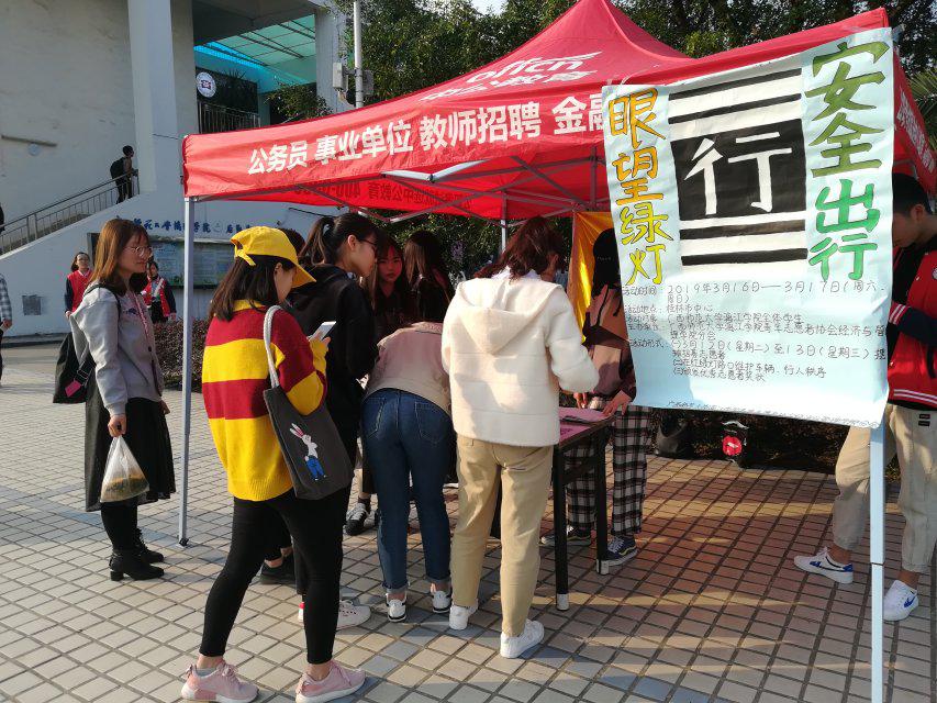 3月16日早上8点志愿者们在停车场集合签到后与负责人王彦文老师一起乘校车前往桂林市区。到了市区,志愿者们向当地交警学会指挥手势后,就拿着指挥旗到安排好的红绿灯口执勤。志愿者们严肃地在红绿灯下提示市民遵章守法,对少数市民等红绿灯时越过斑马线的现象予以劝阻,过路行人们都主动地配合志愿者们工作。即使是交通繁忙的路口,在我们志愿者的指挥下也变得井然有序。站岗的过程是艰辛的但志愿者们都尽职尽责,为市民营造了安全的出行环境。