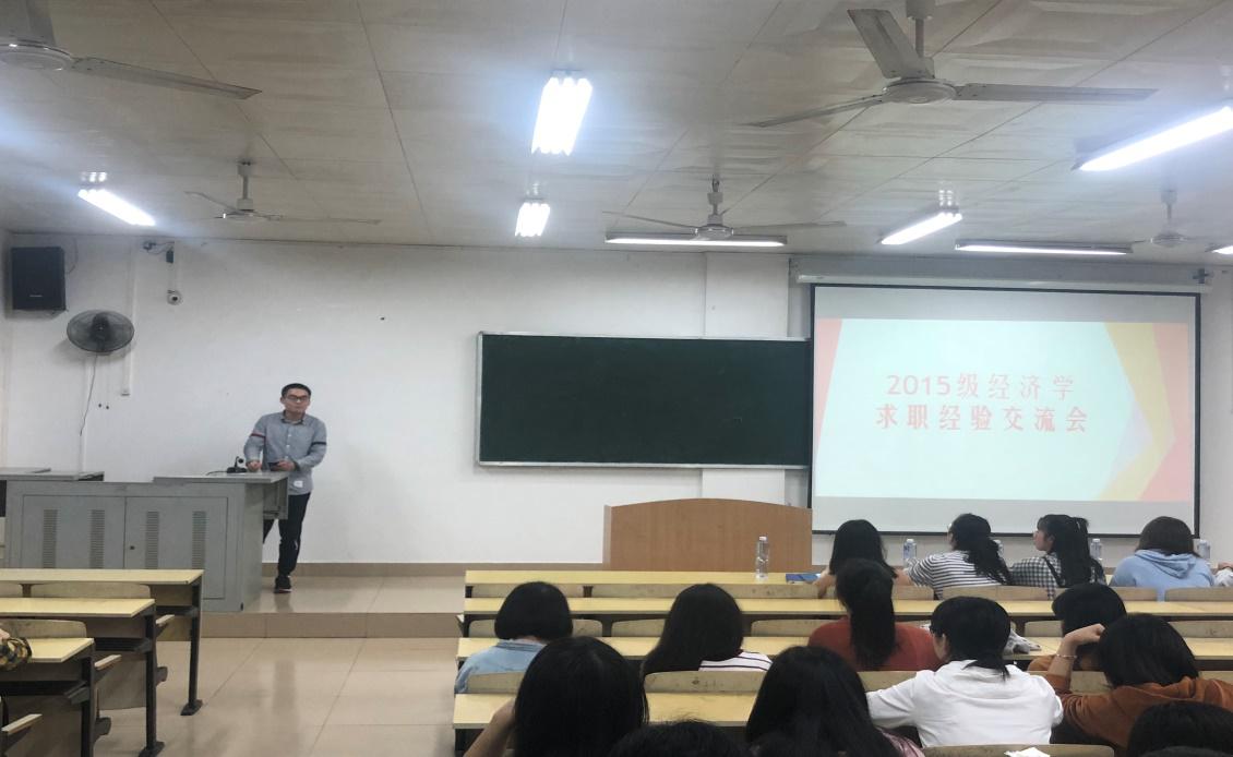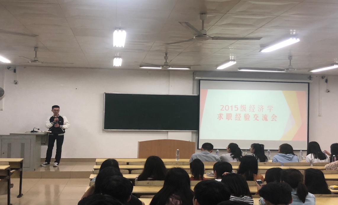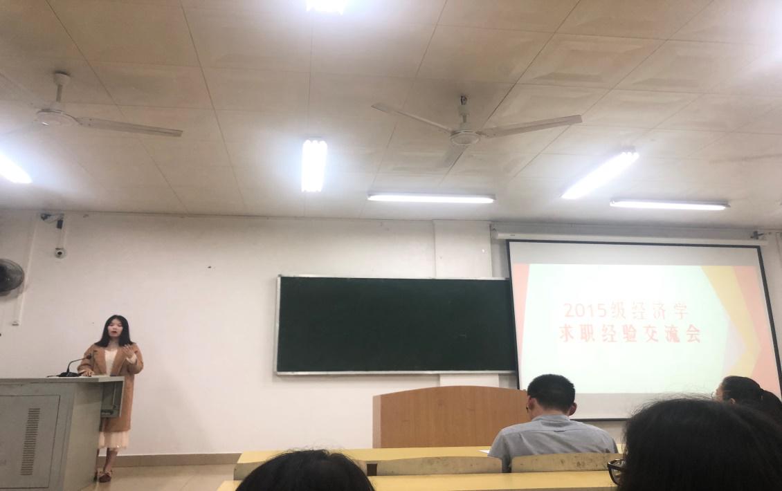 2019年3月21日晚7点,经济与管理学院2015级经济学求职经验交流会在1402教室顺利举行。本次会议邀请了8名2015级经济学专业毕业生作为嘉宾出席交流会,由2016级、2018级经济学专业的同学参加。会议由潘儒培同学主持。