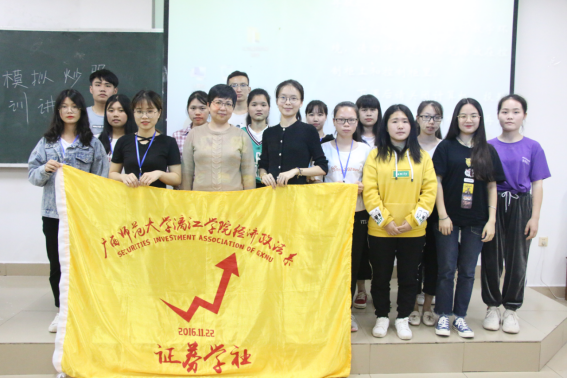 为迎接我校十八周年校庆,向广大师生展示我院的专业特色,经济与管理学院开展了面向全校师生的模拟炒股大赛。4月28日,东方证券桂林营业部赵雯莅临我校,于1411教室举行模拟炒股大赛讲座。邢祎老师担任本次讲座嘉宾,各参赛选手以及我校证券学社全体人员参与了此次讲座。