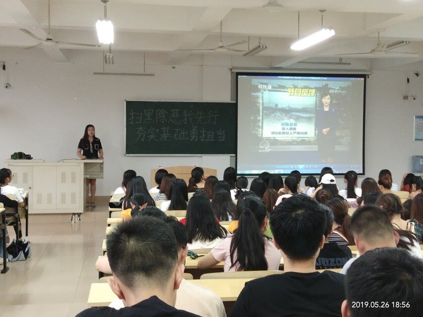 首先,老师们对同学们介绍什么是黑恶势力及基本特征,了解社会黑势力对社会的危害,知道扫黑除恶的重大意义,培养学生树立正确的世界观、人生观和价值观。接着,观看2018年12月27号焦点访谈的视频,通过活生生的案例,让同学们深刻地感受黑恶势力的社会危害,使同学们学习正确的理论思想,善于区分观念的正确与否,把握好自己的言行。最后,各班辅导员对本次班会进行总结,在平时的学习生活中,要时刻保持警惕,并强调同学们要学会用法律的武器来保护自己和捍卫我们自己的权利。请牢记拨打举报电话:12389 。