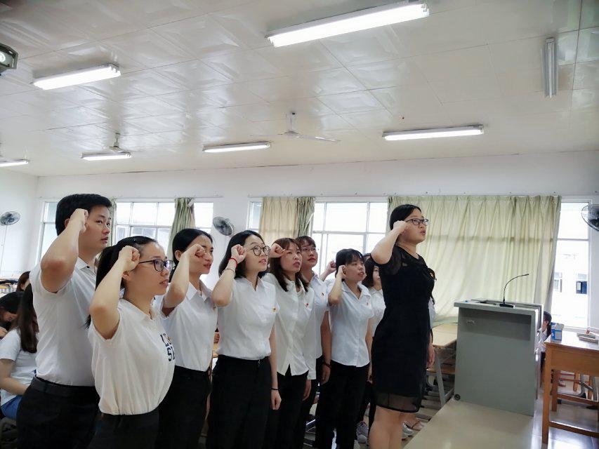 最后,由正式党员进行不记名投票,支部纪检委员甘静燕点票并宣读大会决议,姚金芳、梁彬彩等13名预备党员全票通过成为中共正式党员;紧接着由支部书记郝环一带领成功转正的同志宣读了入党誓词。