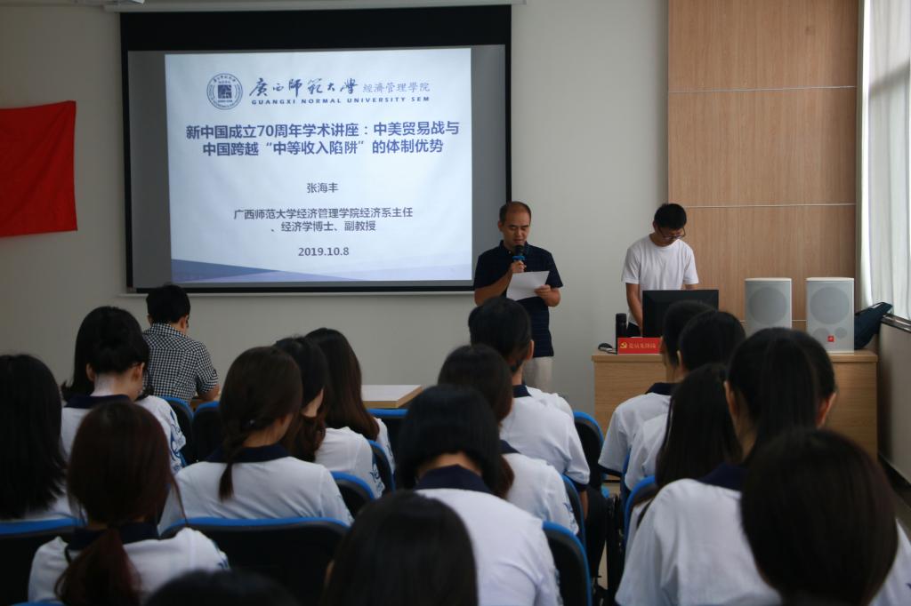 为庆祝新中国成立70周年,丰富节庆内涵,经济与管理学院党总支策划了庆祝新中国成立70周年系列学术讲座,10月8日下午,讲座进行第一讲,主讲人为广西师范大学经济管理学院经济系主任、副教授张海丰博士。学院师生代表近100人参加了此次讲座。