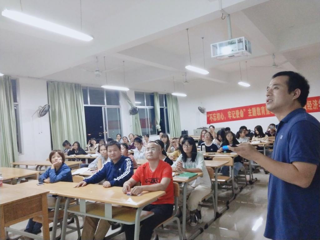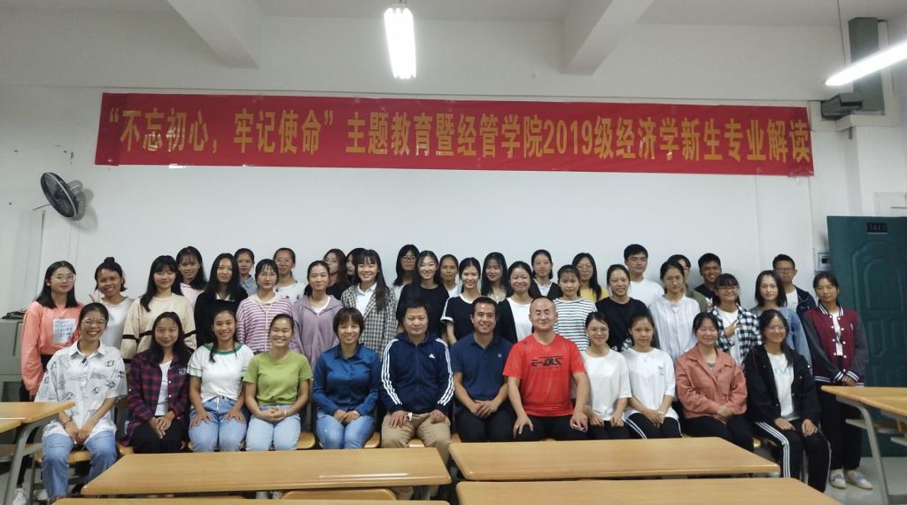 为庆祝中华人民共和国成立70周年,提升我院2019级经济学新生对经济学专业的理解和认识,10月20日晚,经济与管理学院经济学教研室组织2019级经济专业全体学生开展“不忘初心、牢记使命”主题教育暨2019级经济学新生专业解读活动。学院副院长李志献,19级经济学专业辅导员党延伟,经济学教研室全体教师到场参与了此次活动,经济学教研室康旺强老师主持此次活动。
