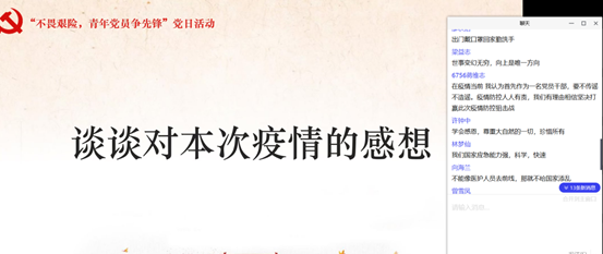 首先,通过观看《鼠年战役33天》和《习近平总书记给抗击疫情的“90后”党员回信》让在座的支部党员更深一步认识到“天下兴亡,匹夫有责”的时代责任感,充分展现了青年党员们冲锋在前,舍生忘死的贡献精神,进一步促进了支部成员自觉加强思想道德修养,做一名爱学习,勤思考,有自信,敢担当的青年学生党员。其次,参加疫情防控的志愿者学生党员积极分享自己的所感所悟,使大家再次学习这种为人民服务的精神。再次,党支部全体成员共同发表了对这次疫情的感想,让我们感受到了作为一名大学生党员,应该主动肩负起时代所赋予我们的使命,积极参与到国家需要我们的地方,时刻铭记着为人民服务的精神!