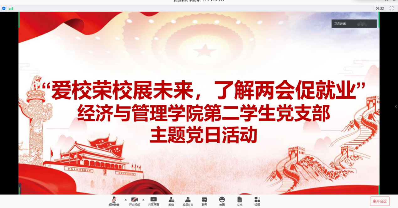 为进一步加强全国两会精神的学习,坚定大学生理想信念,提高思想政治素质,培养学生党员的爱校荣校情怀,我院第二学生党支部于5月31日通过腾讯会议,组织开展“爱校荣校展未来,了解两会促就业”主题党日活动,会议由党支部书记谢鹃霞老师主持,全体党支部成员参加。
