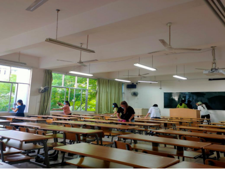 11日,在负责人的部署下,各组组长带领自己的队员们开始了清扫教室、校道、停车场、篮球场的工作。清扫期间,每位同学秉承着吃苦耐劳的精神以及细心负责的态度来完成这项工作,他们积极清扫垃圾,不怕脏、不喊累,互相配合,最终完成了教室楼、大阶梯、停车场、室外球场的清扫工作。12日,同学们早早拿着扫帚来到篮球场,协助保洁阿姨们洒水,拖地,完成了对篮球场淤泥的冲洗清扫以及周边残留垃圾的打扫。
