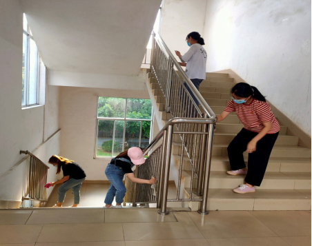 同学们擦拭教学楼楼梯的扶手