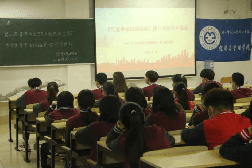 2020年9月28日(星期一)19:30,经济与管理学院第二期“青年马克思主义者培养工程”大学生骨干培训班第一次理论课程学习在1314教室顺利开展,学习的主题是《习近平谈治国理政》第三卷的领学。莅临本次理论学习课程的嘉宾有经济与管理学院团总支书记黄淑娟老师、教育与音乐学院周杰老师,及123名学员。