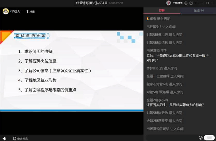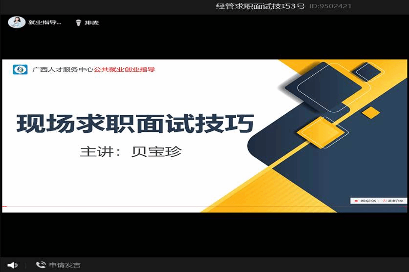 为了使2021届毕业生更好地进行求职面试前的准备,鼓励同学们调整好心态,积极就业。我院特邀广西区就业指导专家贝宝珍和蒋敏两位老师,分别于11月3—4日,通过线上的形式,为我院750多毕业生进行求职面试技巧指导。
