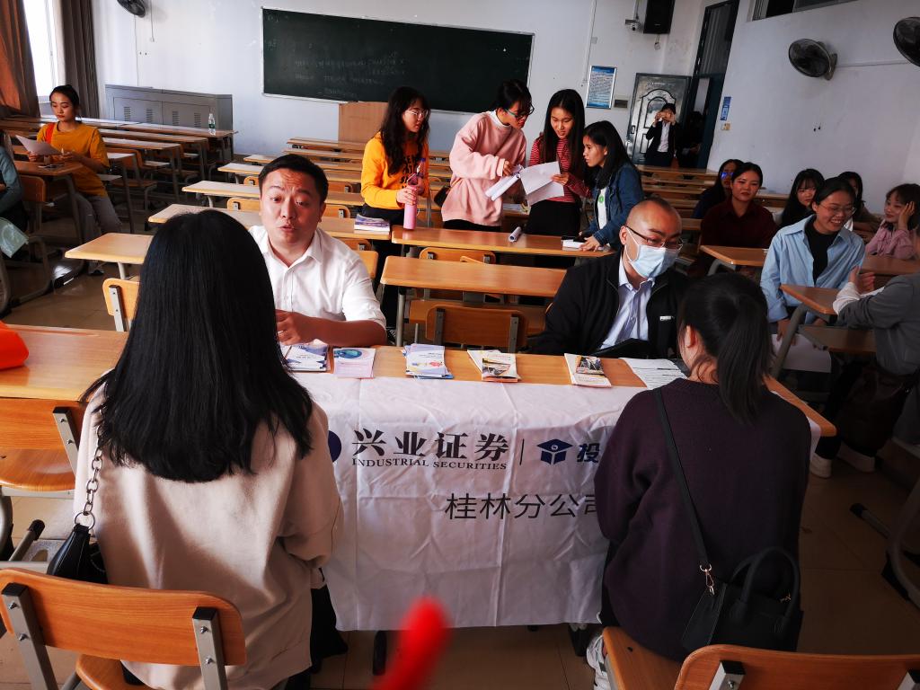 为了帮助2021届毕业生更好地了解就业形势,明确毕业生的就业目标,拓宽就业渠道。11月12日15:00,我院特邀东北证券桂林穿山东路营业部、兴业证券桂林中山北路营业部和申万宏源证券桂林漓江路营业部共三家单位来我院召开招聘宣讲会。宣讲会在1315教室举行,由郝环一老师主持,2017级各专业毕业生共150人参加此次宣讲。