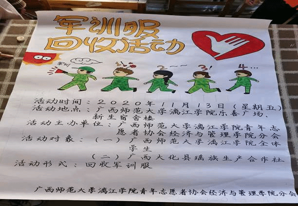 为了提高同学们节约资源的意识,践行“奉献、友爱、互助、进步”的青年志愿者精神,青年志愿者协会经济与管理学院分会于11月13号在乐善广场开展回收军训服活动。