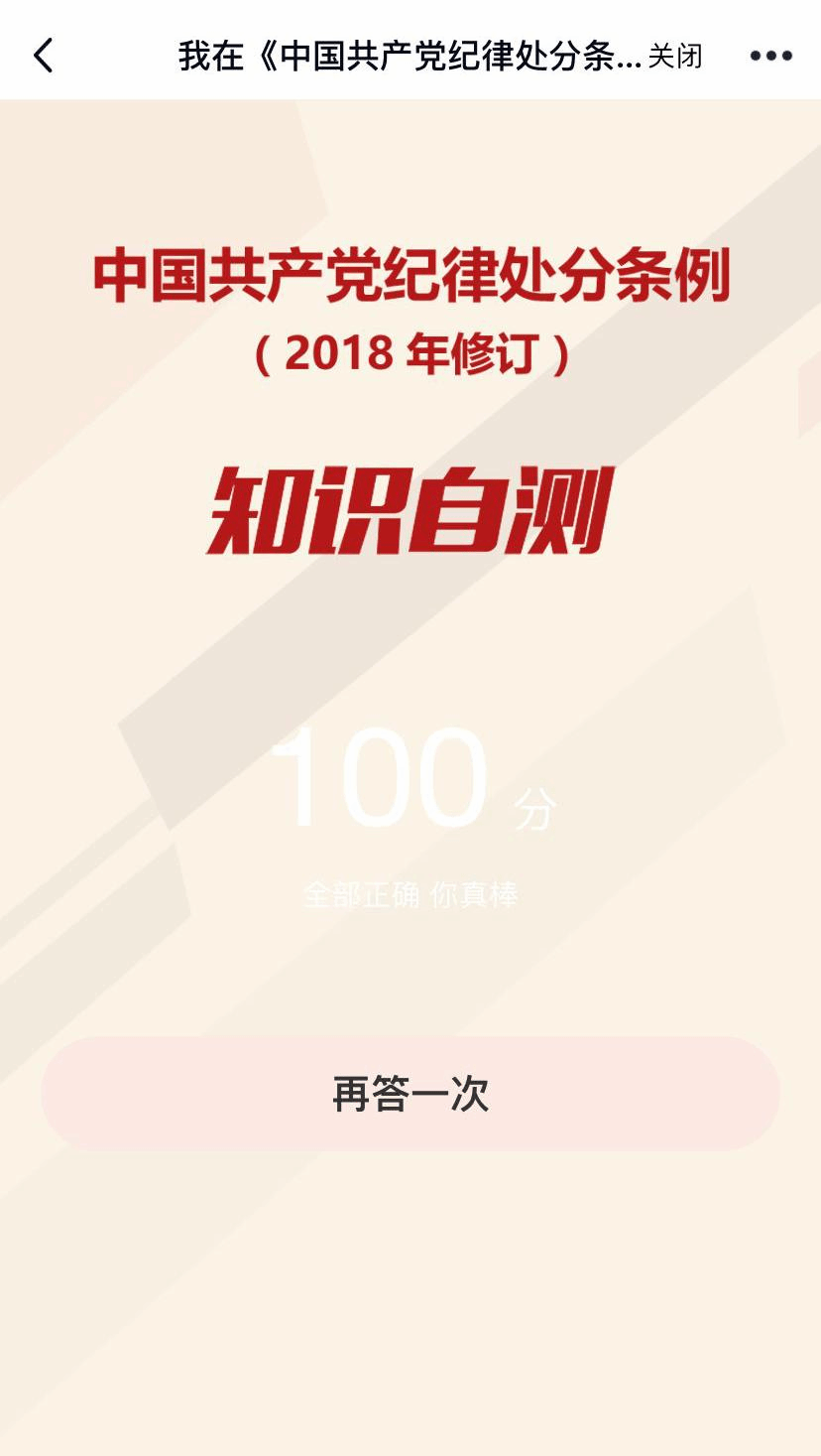在本次学习活动过程中,针对学习《中国共产党纪律处分条例》的同时,对全体党员进行了知识测评。活动伊始,支部党员同志就《条例》积极进行分组学习并踊跃向其他同志分享自己的学习心得。同时本次活动也对党员提出了四点要求:第一,要坚决维护习近平总书记党中央的核心、全党的核心地位,坚决维护党中央权威和集中统一领导;第二,要切实把贯彻好《条例》,做到入脑入心,不断增强党章党纪党规意识,真正做到内化于心、外化于行;第三,要充分发挥纪律建设标本兼治的利器作用;第四,要切实加强纪律教育,自觉遵守党章。学习之后支部对党员同志进行统一的测评,经考核,支部同志测评成绩优秀率达百分之百,真正做到了将《条例》知识融入心中。