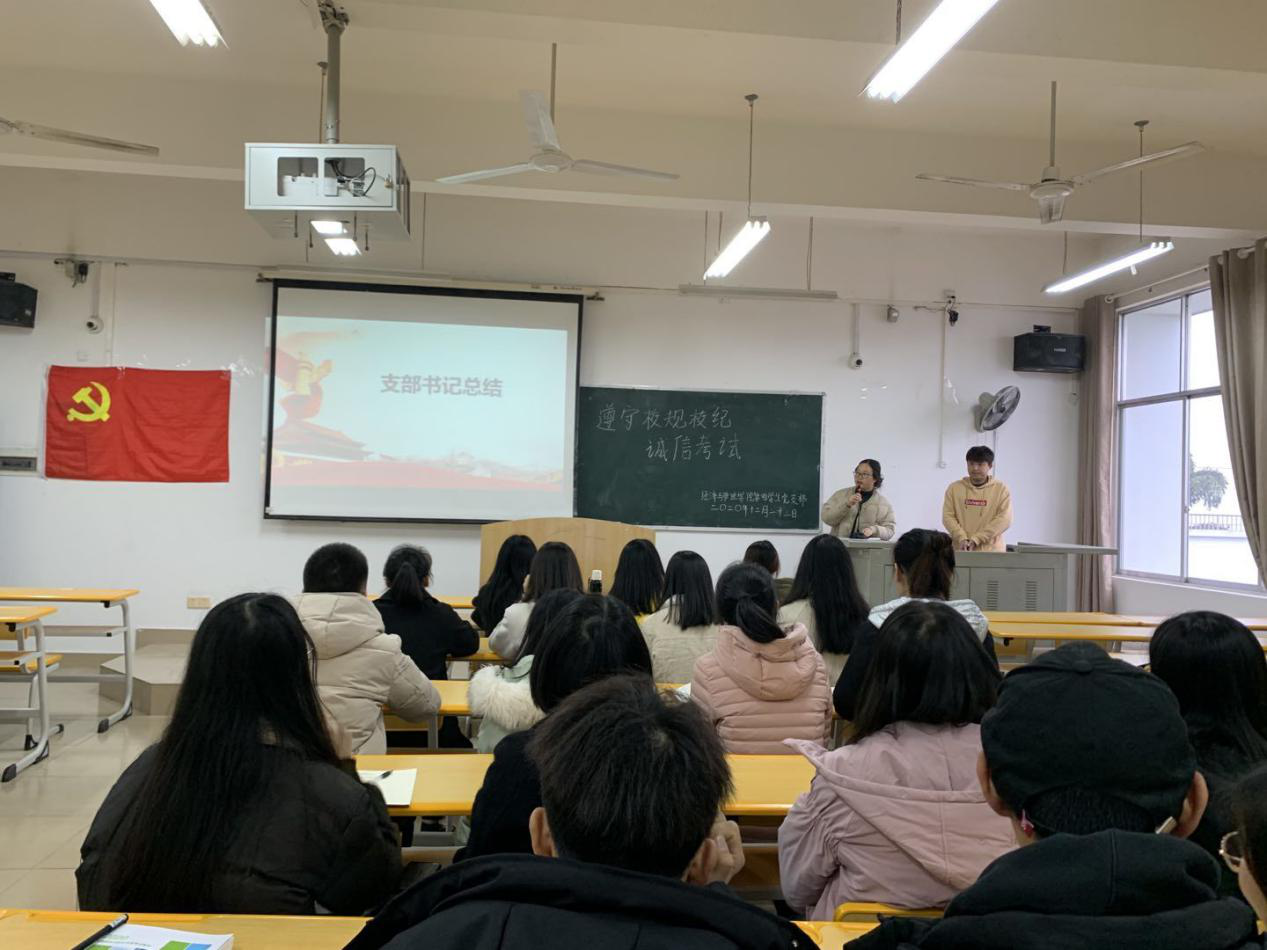为弘扬校训精神,强化学生党员规矩意识,严肃考风考纪,经济与管理学院第四学生党支部于12月23日在1502教室召开了以“遵守校规校纪,诚信考试”为主题的党日活动,支部书记郝环一同志出席本次会议,支部全体成员参加。