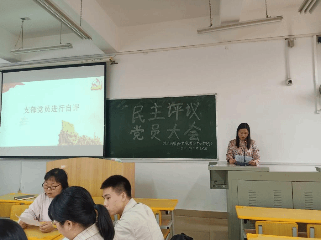 3月18日下午14:30,经济与管理学院第四学生党支部在1508教室召开民主评议党员大会,此次大会由党支部书记郝环一同志主持,支部成员全体参与。