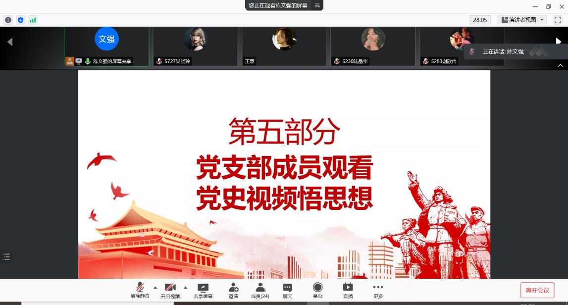 主持人带领着支部成员重温党的100年光辉历程,让支部成员深刻感悟党的初心使命,做到树立远大理想、坚定理想信念、始终保持对党的忠诚。为进一步深入了解党的光荣奋斗史,组织观看《一百堂党史》视频,讲述了党从无到有,从小到大,不断发展壮大的艰难历程;中国共产党一路风雨兼程,在前行的道路上,披荆斩棘,攻坚克难,谱写了一篇伟大的壮丽史诗。支部成员张希同志发表感想:学习党史,必须理论联系实际,学以致用,以学促用,切实做到学史明理、学史增信、学史崇德、学史力行。大学生党员对党章、党史的知识学习,能使青年大学生党员以真正的科学精神和求学实践度过大学时光,在奋斗中实现青春理想,不忘初心,不负年华。