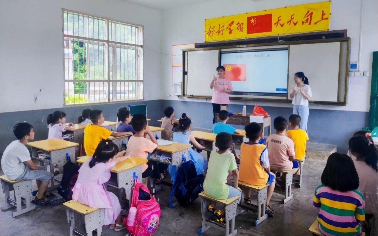 图1:“爱心助教小分队”团队成员带小朋友们认识国旗、党旗和团旗