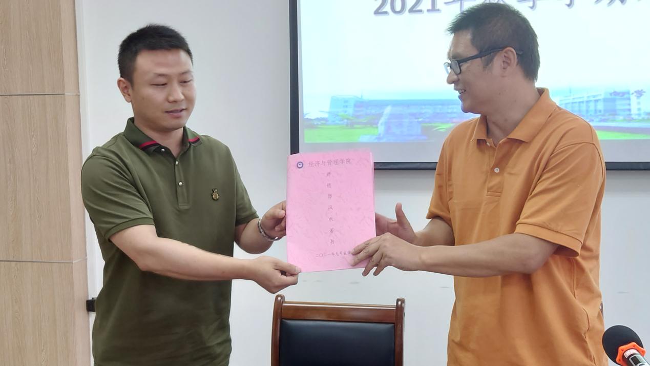 会上,学院组织全体教师开展师德师风专题学习,新教师代表向院长彭润华签订并递交了《经济与管理学院师德师风承诺书》。