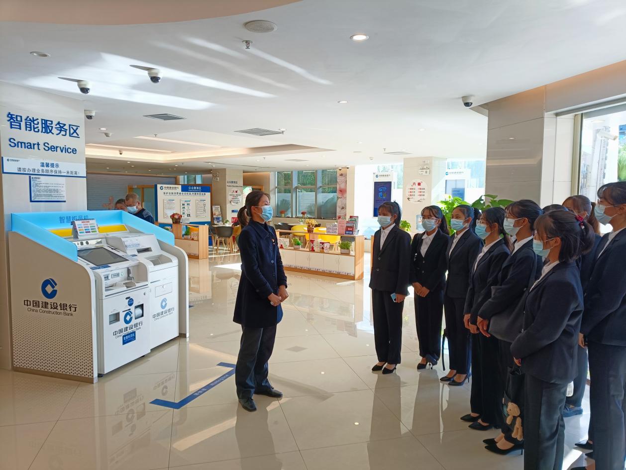 建设银行桂林分行人力资源部副经理秦南茜对我院师生的到来表示欢迎。秦经理详细讲解了建设银行桂林分行的各种前台职能以及各类自助机器的功能,同时还向我们介绍了面向广大劳动群体的休息区,让我们更深刻地体会到建行的高标准服务。