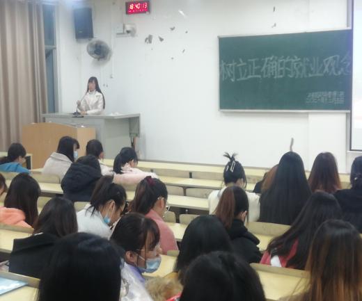主讲人吴东艳老师围绕毕业生该坚持怎样的就业观念进行了详细的讲解,主要从以下几个方面展开:要紧靠自己的专业,适当的寻求大平台,要有恒心和毅力以及端正的态度,树立正确的就业价值取向。吴老师指出在当前严峻的就业形势下,毕业生应根据自身的特点积极转变就业观念,认清就业形势,培养自我意识,把握好就业机会、增强竞争择业和服务基层的观念,遇到挫折时要正确面对,调整好心态,积极就业,以最佳的状态去迎接崭新的明天。