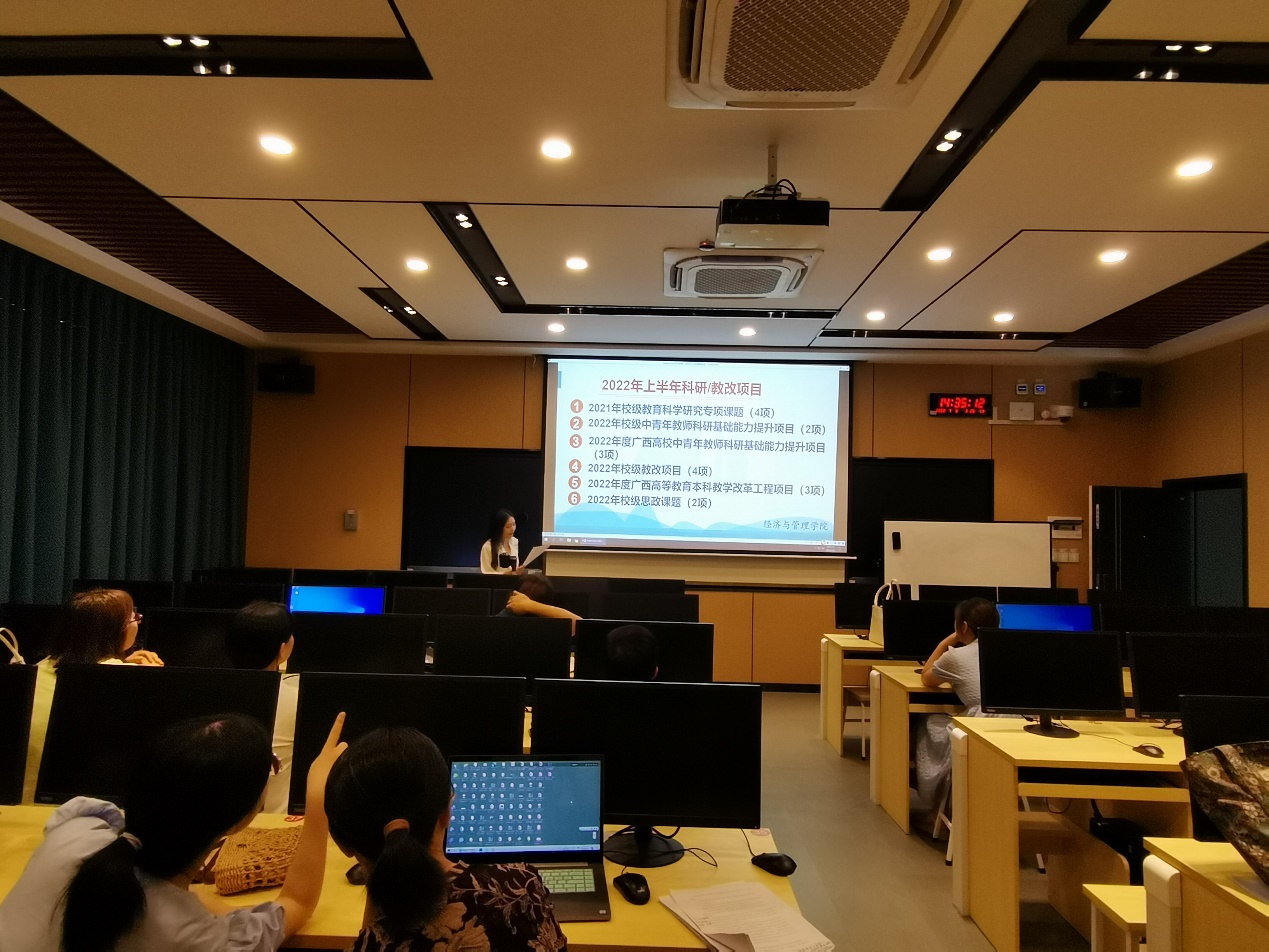 开题报告会开始,副院长郑竹青介绍了经济与管理学院2022年上半年累计获科研/教改项目18项,包括:2021年校级教育科学研究专项课题立项4项、2022年校级中青年教师科研基础能力提升项目立项2项、2022年度广西高校中青年教师科研基础能力提升项目立项3项、2022年校级教改项目立项4项、2022年度广西高等教育本科教学改革工程项目立项3项、2022年校级思政课题立项2项。
