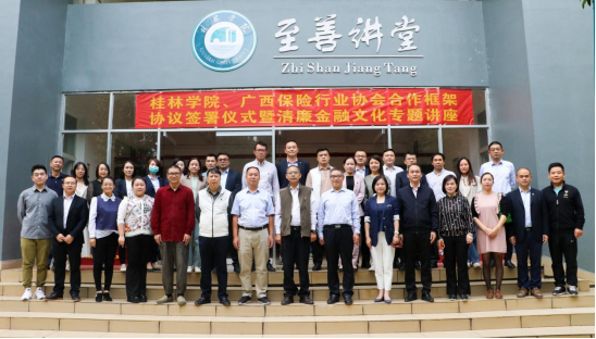 10月19日下午,在全国上下热烈庆祝党的二十大胜利召开的喜庆氛围下,学校与广西保险行业协会举办校企合作签约仪式暨清廉金融文化专题讲座进校园活动。学校校长杨树喆、副校长祝芸芸,广西银保监局纪委办公室副主任代洪军、广西保险行业协会专职副会长蒋光湘,桂林银保监局分局纪委书记龙宪泓、桂林保险行业协会相关领导、桂林市部分保险公司代表以及桂林学院经济与管理学院行政负责人,教学科研处负责人,学院师生代表共140余人参加此次活动。