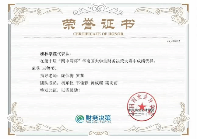 为了深入贯彻落实新时代全国高等学校本科教育工作精神,加快振兴本科教育,构建高水平人才培养体系,服务建设现代化经济体系和实现更高智量更充分就业需要,培养学生终身学习发展、创新性思维、适应时代要求的关键能力。中国商业会计学会举办了“第十届‘网中网杯’大学生财务决策大赛”,11月26日,我校管理工程学院代表队由庞仙梅和罗茜指导老师带领参加此次大赛。最后,在我校两位老师的悉心指导和参赛选手的不懈努力下,我校喜获全国初赛三等奖的优异成绩。