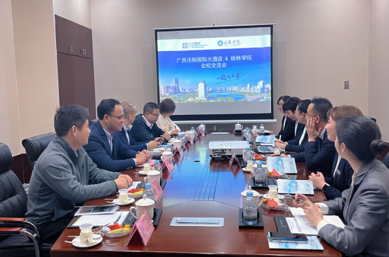 邓志平简要介绍了此行的目的,以及桂林学院发展情况、师资力量和办学理念,并在会上表示,今后将加强校企之间的长期合作,扩展合作类型,从实习、见习、就业指导等方面开展深入合作和交流。酒店副总经理李彦、酒店人事总监胡孟洁在会上详细介绍了酒店发展历程、目前酒店升级调整和经营成果。李副总经理也表示疫情恢复后酒店招聘需求旺盛,也将期待更多新鲜血液加入。随后双方着重围绕毕业生的就业岗位,毕业生实习生的平台落实等进行了座谈交流,基本达成了满意的共识。