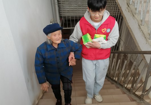 志愿者正在扶老人上楼