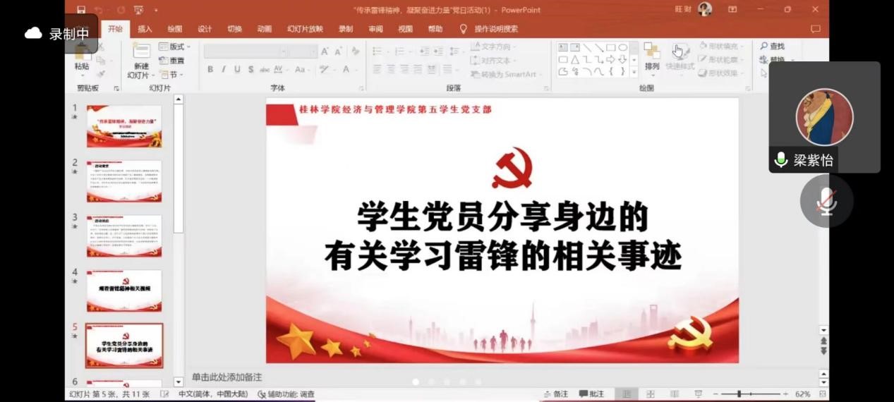 为保持共产党员的初心本色,党支部通过组织开展系列教育活动学习和弘扬雷锋精神。3月30日经济与管理学院第五学生党支部通过腾讯会议,开展“传承雷锋精神,凝聚奋进力量”主题党日活动。党支部全体成员参加此次活动。