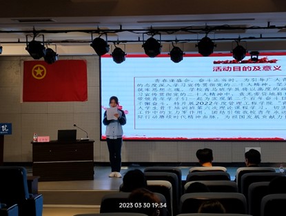 首先,奏唱中国共青团团歌《光荣啊,中国共青团》。接着,在主持人宣读目的及意义后,本次课程拉开帷幕。在党的二十大报告中,习近平总书记对我们广大青年提出了,要坚定不移听党话、跟党走,立志做有理想、敢担当、能吃苦、肯奋斗的新时代好青年。宋丹阳老师讲解《党的二十大精神》,引导广大青年学子以昂扬的姿态、务实的态度深入学习宣传贯彻党的二十大精神,坚定理想信念,厚植爱国情怀,筑牢思想之魂。青马班学员将以高度的政治责任感、使命感投入到学习宣传贯彻党的二十大精神中,责无旁贷地肩负起“排头兵”的光荣使命,一起为实现第二个百年奋斗目标,实现中华民族伟大复兴不懈奋斗。