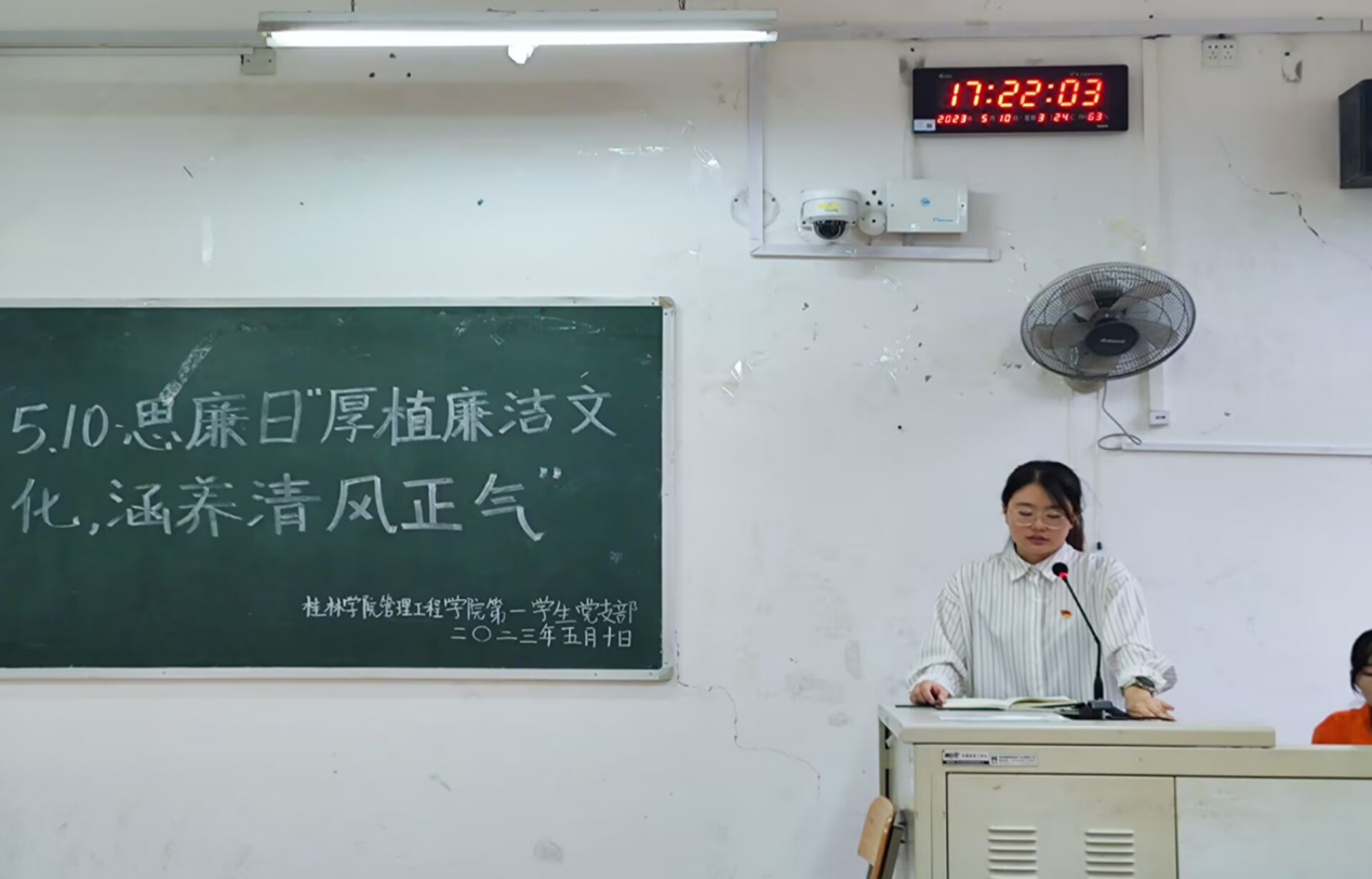 5月10日下午,管理工程学院第一学生党支部在1209教室举行5.10·思廉日“厚植廉洁文化,涵养清风正气”主题党日活动。管理工程学院第一学生党支部书记石盼盼、副书记黄淑娟以及支部全体成员参加此次活动。