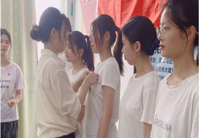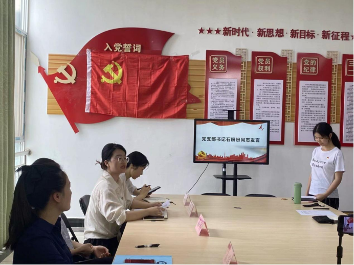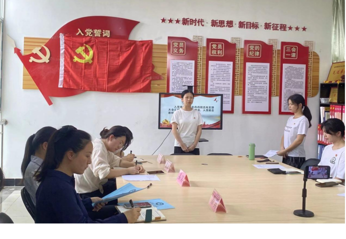 会议伊始,全体肃立,奏唱《国际歌》,王祖惠同志介绍发展对象的入党材料准备情况以及综合政治审查情况。随后,李林霏等5名同志依次上台向党组织汇报自身情况,入党介绍人分别介绍5名同志的现实表现并给予点评及表态。经党支部大会讨论及现场不记名投票,由石盼盼宣读表决结果,将李林霏等5名同志接收为中共预备党员。最后,石盼盼为新发展党员佩戴党徽,表示衷心祝贺并给予殷切期待,勉励新党员要跟上党的步伐,积极参与到支部开展的各项活动中来,不断提高自身思想觉悟,积极学习党的指导思想、理论知识和方针政策,关注国家时事政治,在实践中不断提高自身能力。