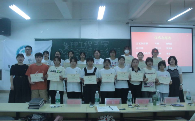 会议伊始,管理工程学院团总支学生会各部门代表上台发言,采取PPT的形式对本学期的工作总结和下学期的工作计划进行汇报。随后,刘竹青老师和赵玲老师为本学年工作突出的30名同学颁发了“优秀志愿者”奖状。最后,赵玲老师对本学期团学工作进行总结,她表示各部门成员应充分利用各种机遇,在挑战自我的舞台上不断突破自我,并且在工作中互帮互助,凝聚发展合力,不断开创团学新佳绩。刘竹青老师也对全体干部提出四点要求:第一,要以身作则,身为团学骨干,要起到模范带头作用,积极组织好各项工作,全心全意为全院师生服务;第二,要不断创新,敢于实践,积极探索团学更好的发展道路;第三,要端正态度,放下架子,营造良好的工作环境;第四,要虚心求教,认真负责,做好每一件事,要向身边的人多学习,多请教。
