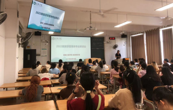 为了进一步加强我院旅游管理类学生对专业的认知,明确自己对专业的选择,为即将到来的专业分流工作做好铺垫,9月26日中午,管理工程学院旅游教研室在1208教室开展了2022级旅游管理类专业解读会。会议由教研室主任奉莹莹老师主持,旅游教研室石丽璠老师、刘小玲老师及2022级旅游管理类学生合计约80余人参加了本次专业解读会。