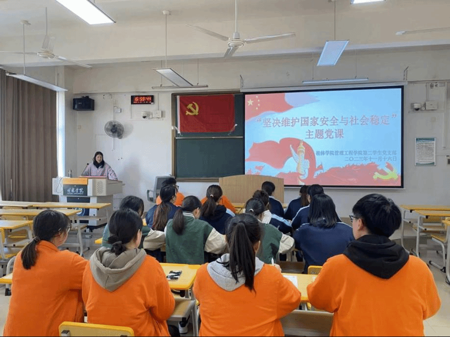 11月16日下午,管理工程学院第二学生党支部书记谢鹃霞在1506教室以《坚决维护国家安全与社会稳定》为题,为支部全体党员讲授专题党课。