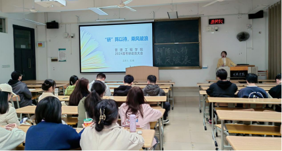 为进一步促进学风建设,营造浓厚的学习氛围,积极调动2024届毕业生的考研积极性,帮助各位考研人科学备考。11月17日晚上,管理工程学院邀请辅导员沈娟开展《以“研”阵以待,乘风破浪》为主题的考研动员大会,2020级、2021级有意向考研的学生参加了此次动员大会。
