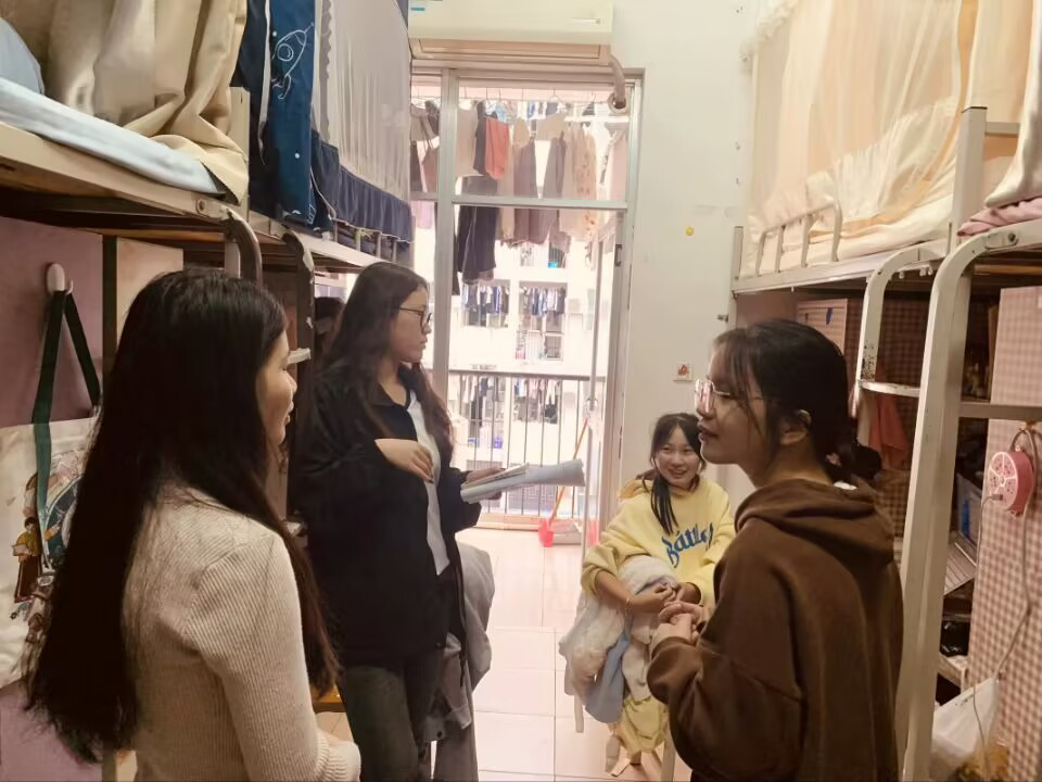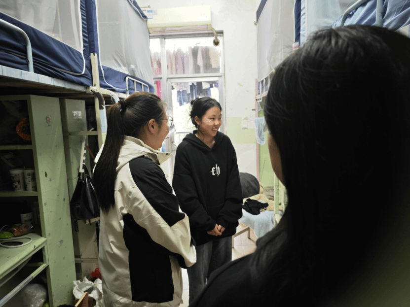 在走访过程中,党支部书记石盼盼对大家提出的关于学习、生活和校园安全管理等各方面的问题进行记录并一一解答。每到一处,石盼盼都要强调寝室用电安全、内务整理等事宜,对环境卫生较好、宿舍氛围活跃的宿舍进行表扬,对存在问题的寝室提出了整改建议和鼓励关切。同时,党支部成员与同学们就学业进展、未来规划、心理状态作了深入交流。最后,石盼盼提出期望,希望大家加强自我管理,落实安全用电的相关制度,保持整洁有序的宿舍环境。养成健康文明、积极向上的生活习惯,保持阳光开朗、乐于表达的良好心态。珍惜在校时光,充分利用课余时间开展各种有益身心健康的科研、文体活动,留下丰富、充实、美好的大学时光。