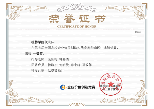 2024年4月20日,我校桂林学院管理工程学院成功举办了第七届全国高校企业价值创造实战竞赛,在桂林学院管理工程学院指导老师庞仙梅、梁晓珊和钟嘉杰老师的悉心指导下,我校在本次竞赛中荣获金融队华南区奖项一等奖第一名,会计队华南区三等奖的光荣佳绩。此次成果充分激励了我校教师在“以赛促改、以赛促教、以赛促学、以赛保健”为基本原则的目标上再创新高的信心和决心。
