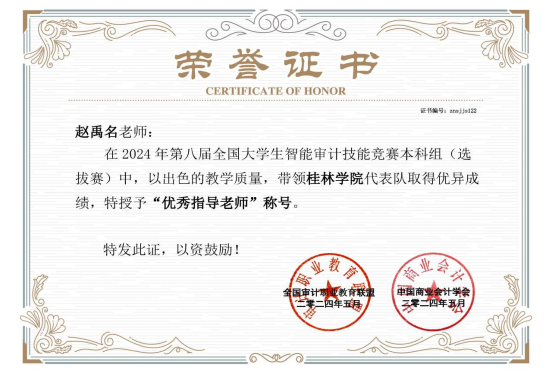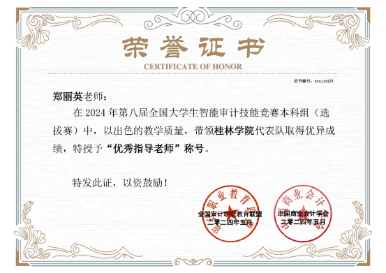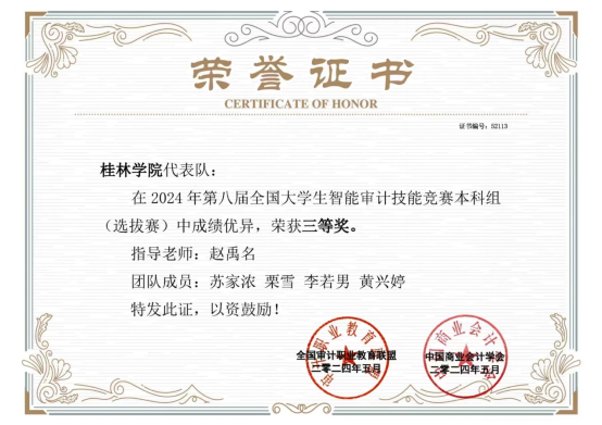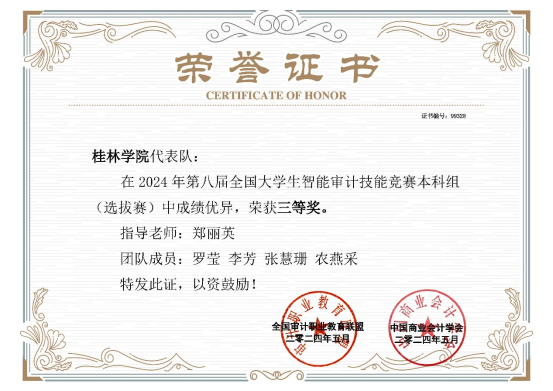 由中国商业会计学会联合全国审计职业教育联盟举办的“网中网杯”第八届全国大学生智能审计技能竞赛,于2024年5月17日进行了初赛,在桂林学院管理工程学院指导老师赵禹名、郑丽英老师的悉心指导下,带领两支由我院审计学专业学子组成的参赛队伍完成了比赛,在1207教室经过线上三小时努力拼搏,此次竞赛中,两支队伍均在全国选拔获奖名单中夺得三等奖。