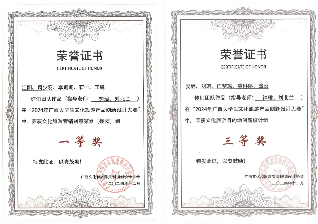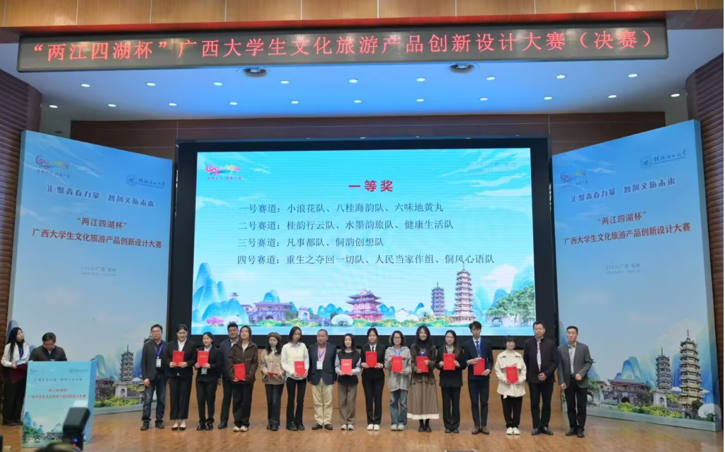12月1日,由广西文化和旅游策划规划设计协会主办,广西壮族自治区教育厅、广西本科高校旅游管理教学指导委员会指导,桂林理工大学旅游与风景园林学院、广西北部湾文化和旅游发展研究院、桂林两江四湖旅游责任有限公司联合承办的2024年广西大学生文化旅游产品创新设计大赛决赛在桂林圆满落幕。我校旅游管理、播音与主持、汉语国际教育等跨专业组合团队在激烈竞争中脱颖而出,取得优异成绩,荣获文化旅游宣传短视频组一等奖1项,文化旅游目的地设计组三等奖1项,优秀指导老师奖2项,优秀组织奖1项。