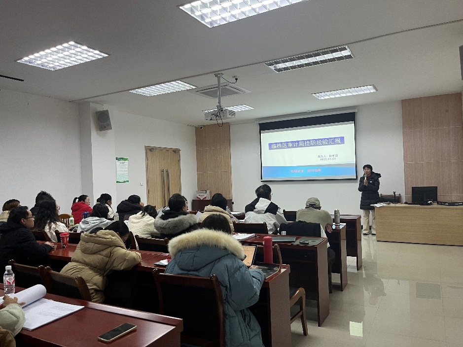 段昕延老师汇报她于2024年1月起,在桂林市临桂区审计局挂任副局长的一年时间里,在多个审计项目、专项审计调研中担任组长、副组长。深入基层一线,解决实际问题,发挥专业特长,带领团队顺利完成审计项目;与临桂区审计局合作广西审计重点科研课题并获得二等奖、开展审计专业发展规划调研、挂职经验融入专业建设与课堂教学、联系学生实习等多项工作经验。