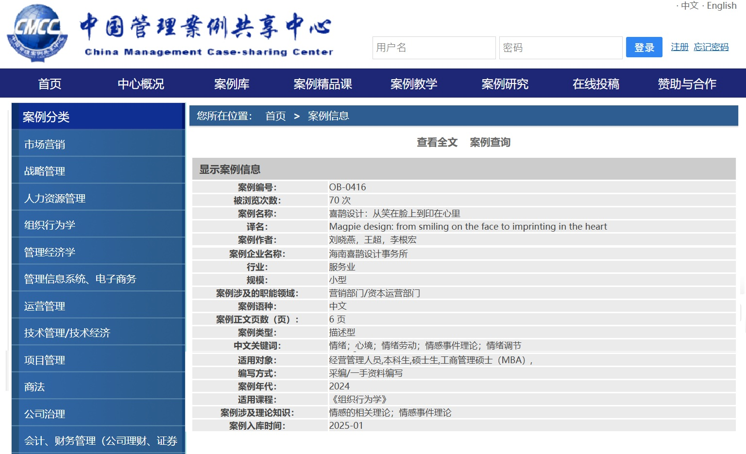 2025年1月21日,我院李根宏老师团队撰写的案例《喜鹊设计:从笑在脸上到印在心里》(组织行为学,编号:OB-0416),经过严格的案例初审、外审专家评阅、修改和终审等程序,正式收录至中国管理案例共享中心数据库。