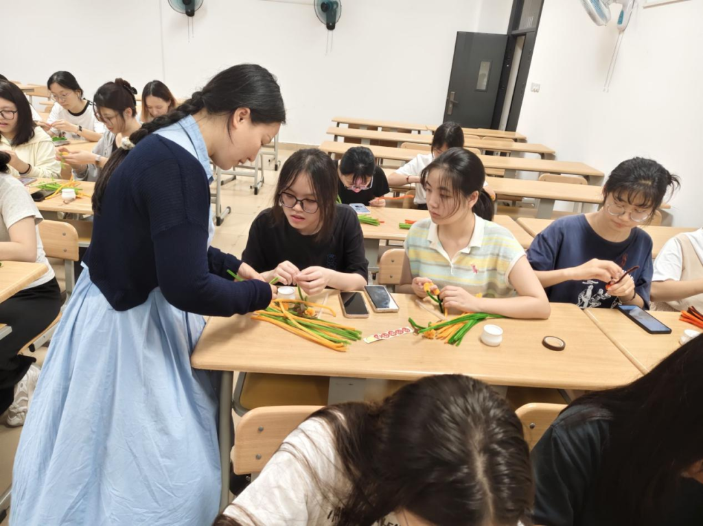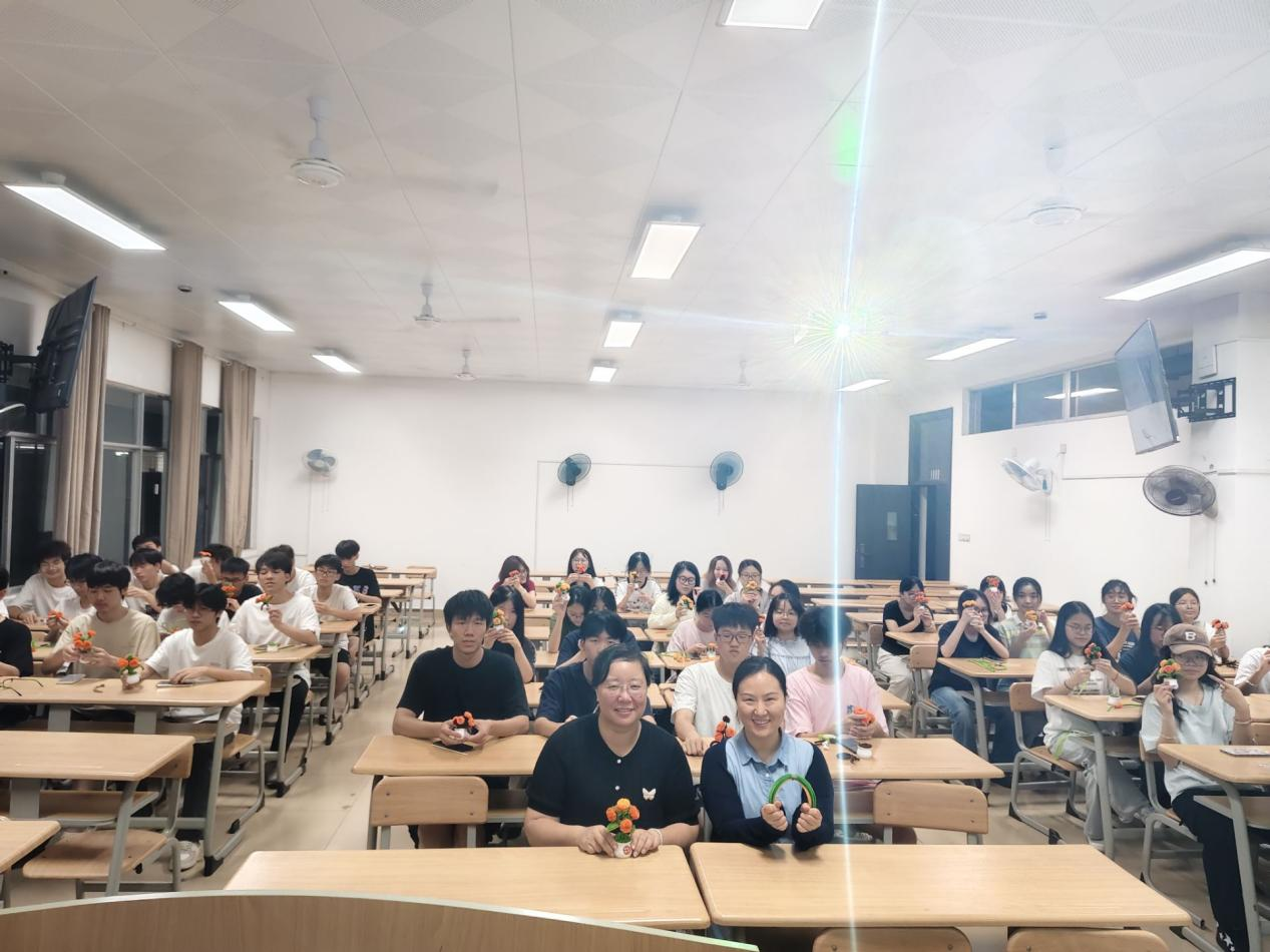 活动围绕“破冰游戏、手工作坊、心得分享会”三个阶段展开。在破冰游戏环节,一系列有趣且富有启发性的心理知识问题引发学生思考,大家在轻松愉快的氛围中放松身心,为活动营造了融洽和谐的环境。手工作坊阶段,学生们分组制作“柿柿”如意小盆栽,主持人详细解说制作方法并循环播放教学视频,学生们互帮互助完成手工作品,在提高动手能力的同时缓解了压力与焦虑情绪。“艺之语”心得分享环节亮点纷呈。各组代表上台展示作品,分享制作过程中的经验与心得。学生们纷纷表示,通过手工创作感受到了愉悦与放松,也在交流中学会了调节情绪的方法。心理老师针对学生在分享中提到的情绪问题进行了专业指导,鼓励大家将手工解压的方式运用到日常生活中。最后,黄淑娟进行总结发言,强调了心理健康的重要性,并为学生送上美好期许。