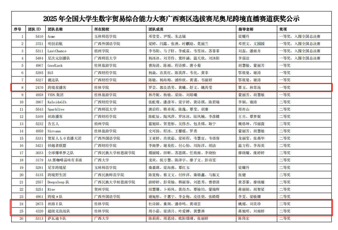 近日,第四届全国大学生数字贸易综合大赛广西赛区获奖名单正式公布。桂林学院参赛团队凭借扎实的专业素养与创新能力脱颖而出,来自电子商务、物流管理、国际经济与贸易三个专业的学子组成的39支队伍在赛场上斩获佳绩,其中两支获一等奖的队伍顺利晋级全国总决赛,彰显了学校在数字贸易领域的强劲实力与人才培养成效。