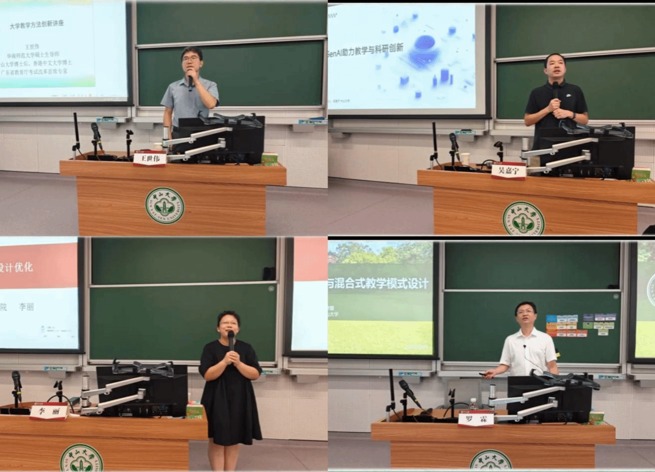 报告中,中山大学生命科学学院王金发教授以国家级精品课程《细胞生物学》为案例,解析开放式教学、研究性学习与课程思政协同设计的底层逻辑与操作框架。王世伟研究员提到,技术只是放大器,真正决定课堂深度的是教师的教学设计与学生的主动投入。吴嘉宁副院长现场展示GenAI在备课、批卷与科研绘图中的高效应用,阐释人机协同如何解放教师高阶育人潜能。周志民教授将市场营销“用户共创”前沿成果即时转化为教学案例,强调学科前沿即教学现场。李丽副教授则通过连续提问与层层追问,示范如何以问题链自然升腾家国情怀与科学精神,实现课程思政润物无声。罗霖副教授以教育数字化转型与混合式教学模式设计为题,系统阐释了数据驱动、场景融合、闭环评价三位一体的课程重构路径。