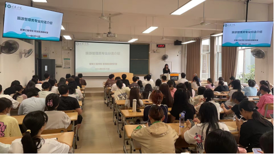9月25日,2023级旅游管理类专业分流宣讲活动在1208会议室顺利举行。宣讲活动由智慧旅游教研室主任刘小玲老师主持,智慧旅游教研室韦达老师、经竣超老师和全体2023级旅游管理类学生参加。