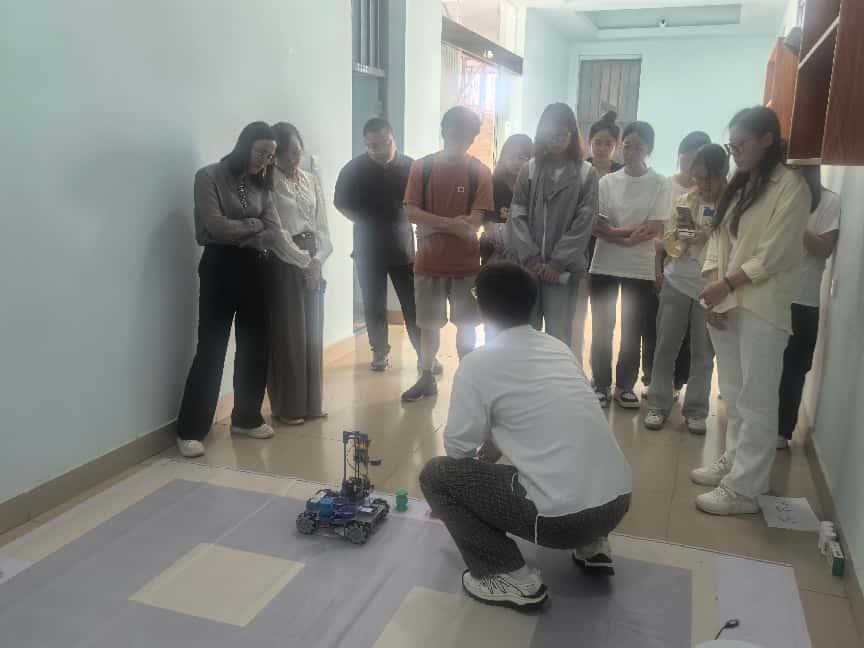 通过模拟还原竞赛场景,展示车辆如何高效完成货物识别、抓取、搬运、配送等任务。从自动化识别与抓取物体设备的精准操作,到搬运路线的高效路径规划;从物流车的万向移动设计,到3D打印抓臂等固件技术,再到数据编程的设计与迭代,每一个演示环节都紧密贴合了物流工程领域的前沿趋势,生动展现了物流工程的发展潜力。面对科技感十足的物流工程车,师生们兴趣盎然,积极提问,与参赛的同学展开热烈互动,就智能设备的运行稳定性、控制移动计算机语言、打印编程等有关问题进行深入探讨,现场学习氛围浓厚。