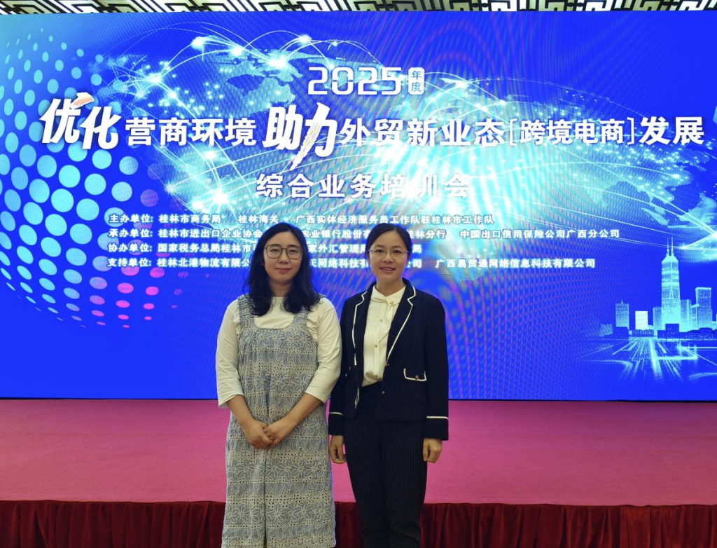 2025年5月29日,我校工商管理学院电子商务教研室主任岳庆英和金融与法律学院国际贸易实务教研室副主任刘雨婷两位老师参加了由桂林市商务局、桂林海关以及广西实体经济服务员工作队驻桂林市工作队联合主办的“2025 年度优化营商环境助力外贸新业态[跨境电商]发展综合业务培训会”。旨在通过学习前沿知识,为我校相关专业教学与学科建设提供有力支持,进一步推动学校与地方经济的协同发展。