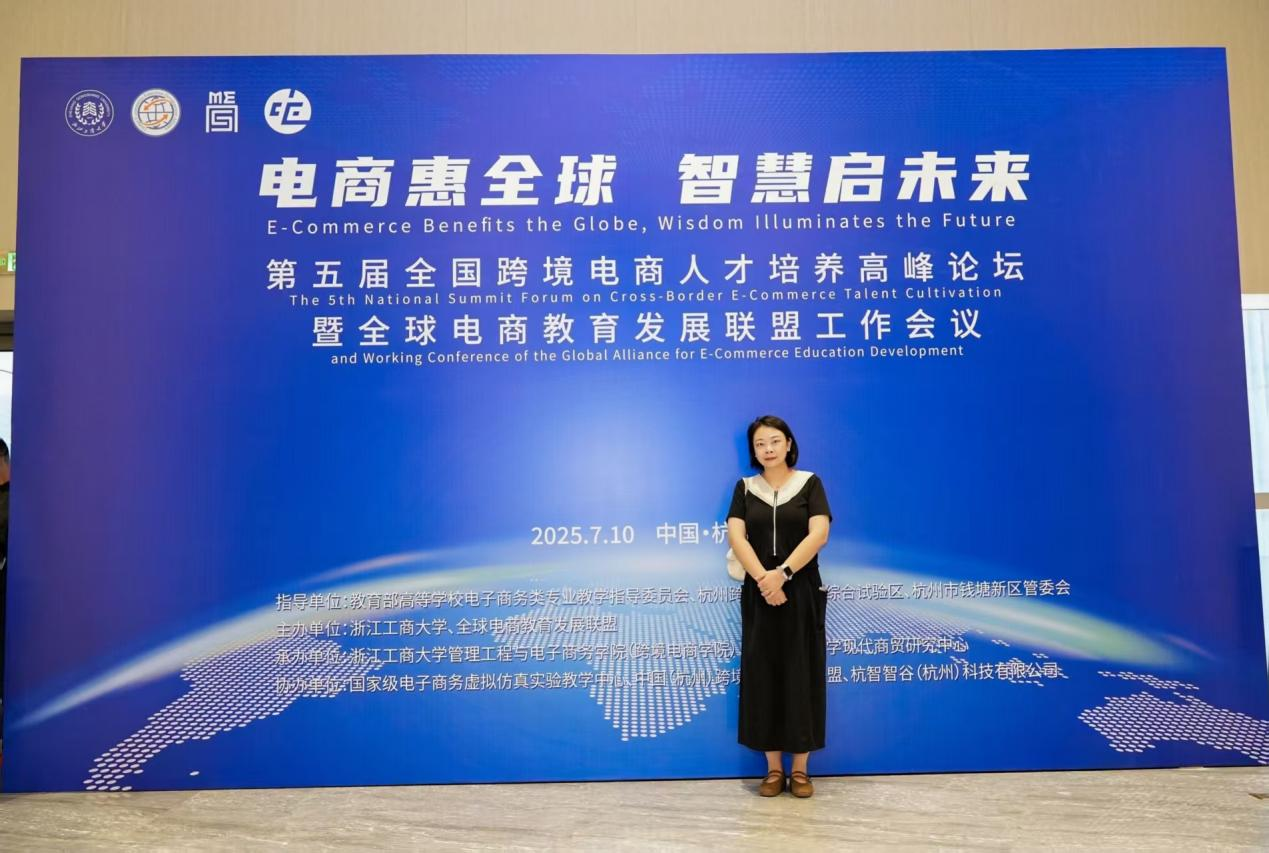 7月10日,“第五届全国跨境电商人才培养高峰论坛暨全球电商教育发展联盟工作会议” 在杭州召开,工商管理学院电子商务专业教师代表覃玉受邀参会。本次论坛以 “电商惠全球・智慧启未来” 为主题,汇聚全球跨境电商领域专家学者、高校教师及企业代表,共探行业发展与人才培养新方向。